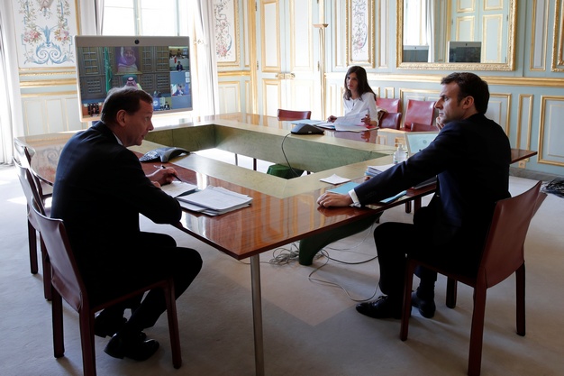 Ο Γάλλος πρόεδρος Emmanuel Macron σε τηλεδιάσκεψη G-20 στο Παρίσι, τον Μάρτιο του 2020. Benoît Tessier / Pool / Reuters