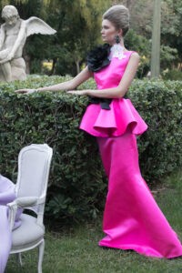 Τα υφάσματα μπροκάρ, εμπριμέ και μονόχρωμα με σταθερή αίσθησή δημιουργώντας όγκους άλλοτε σε υπερβολικά ογκώδη μανίκια, μακριές ουρές και υπερμεγέθεις φιόγκους.