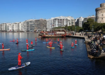 Κωπηλάτες όλων των ηλικιών, από 18 ετών έως και αρκετά μεγαλύτεροι, ντύνονται στα κόκκινα και κωπηλατούν πάνω σε σανίδες sup, δίνοντας ξεχωριστό χρώμα στον Θερμαϊκό Κόλπο, στη Θεσσαλονίκη.