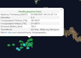 Νέος σεισμός μεγέθους 5,3 βαθμών της κλίμακας Ρίχτερ καταγράφηκε στις 07:31 στον θαλάσσιο χώρο ανοικτά της Νισύρου, σύμφωνα με ανακοίνωση που δημοσιοποίησε το Γεωδυναμικό Ινστιτούτο του Εθνικού Αστεροσκοπείου Αθηνών, το οποίο χαρακτηρίζει «ισχυρό» τον συγκεκριμένο σεισμό.