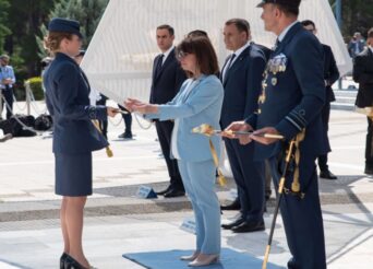 Τα ξίφη στους νέους και νέες ανθυποσμηναγούς επέδωσε η Πρόεδρος της Δημοκρατίας, Κατερίνα Σακελλαροπούλου, κατά τη διάρκεια ειδικής τελετής που πραγματοποιήθηκε στις εγκαταστάσεις της σχολής Ικάρων στην αεροπορική βάση Δεκελείας στο Τατόι. Την Πρόεδρο συνόδευε ο υπουργός Εθνικής Άμυνας, Νικόλαος Παναγιωτόπουλος.